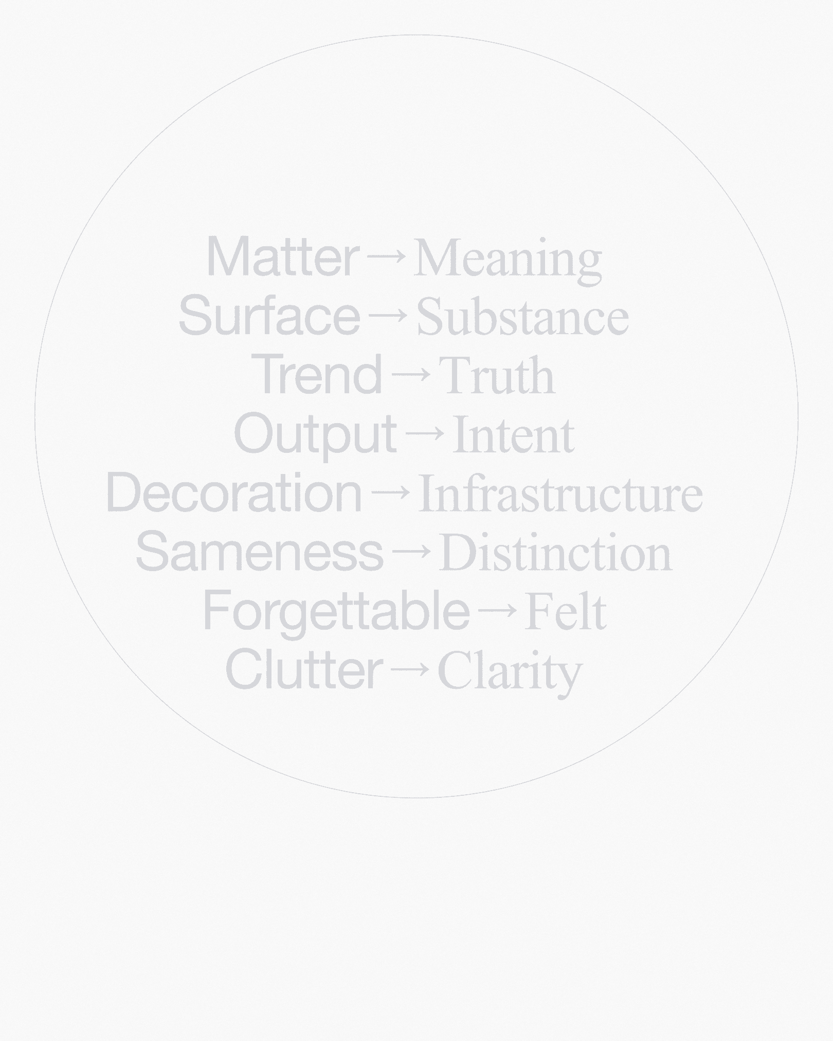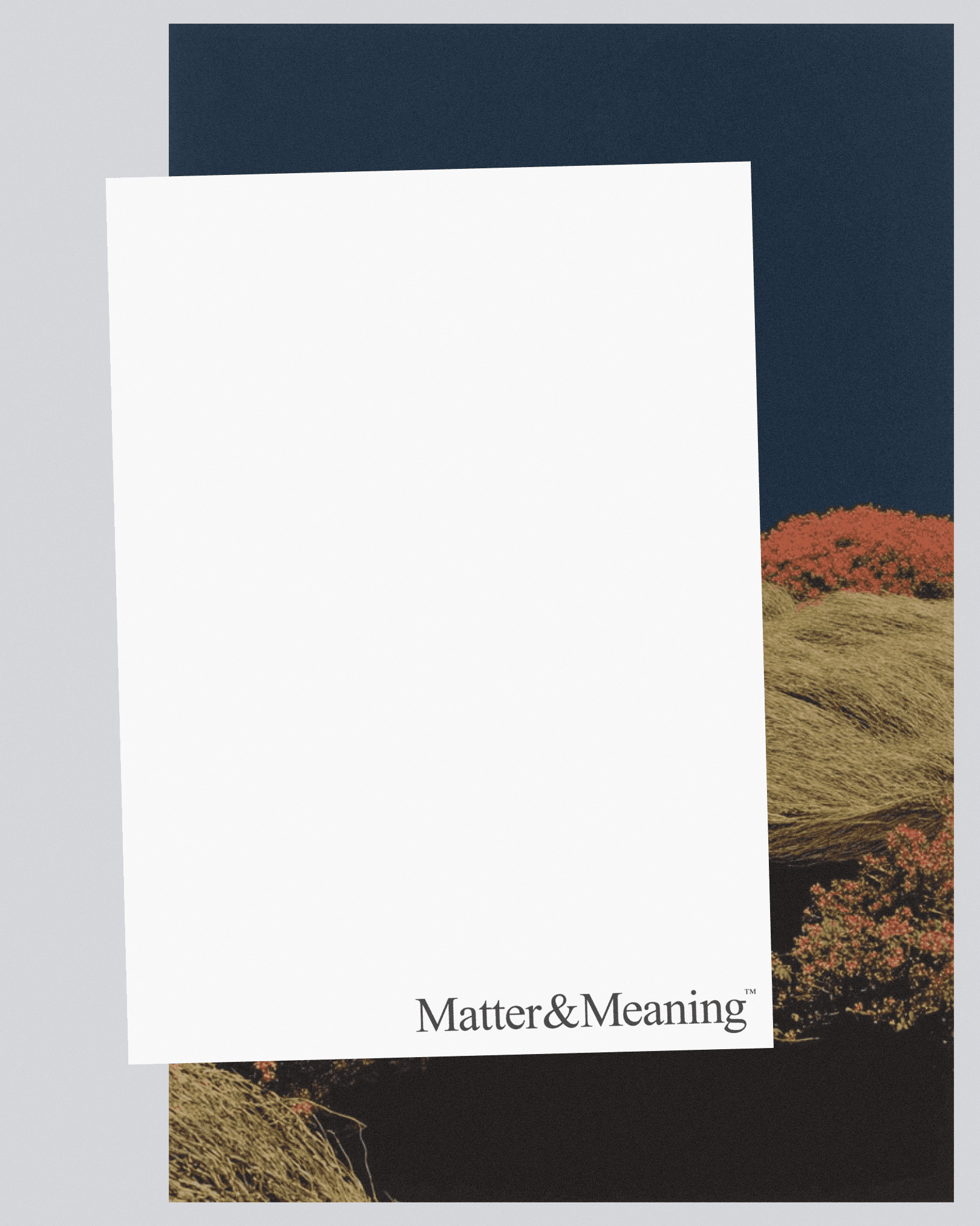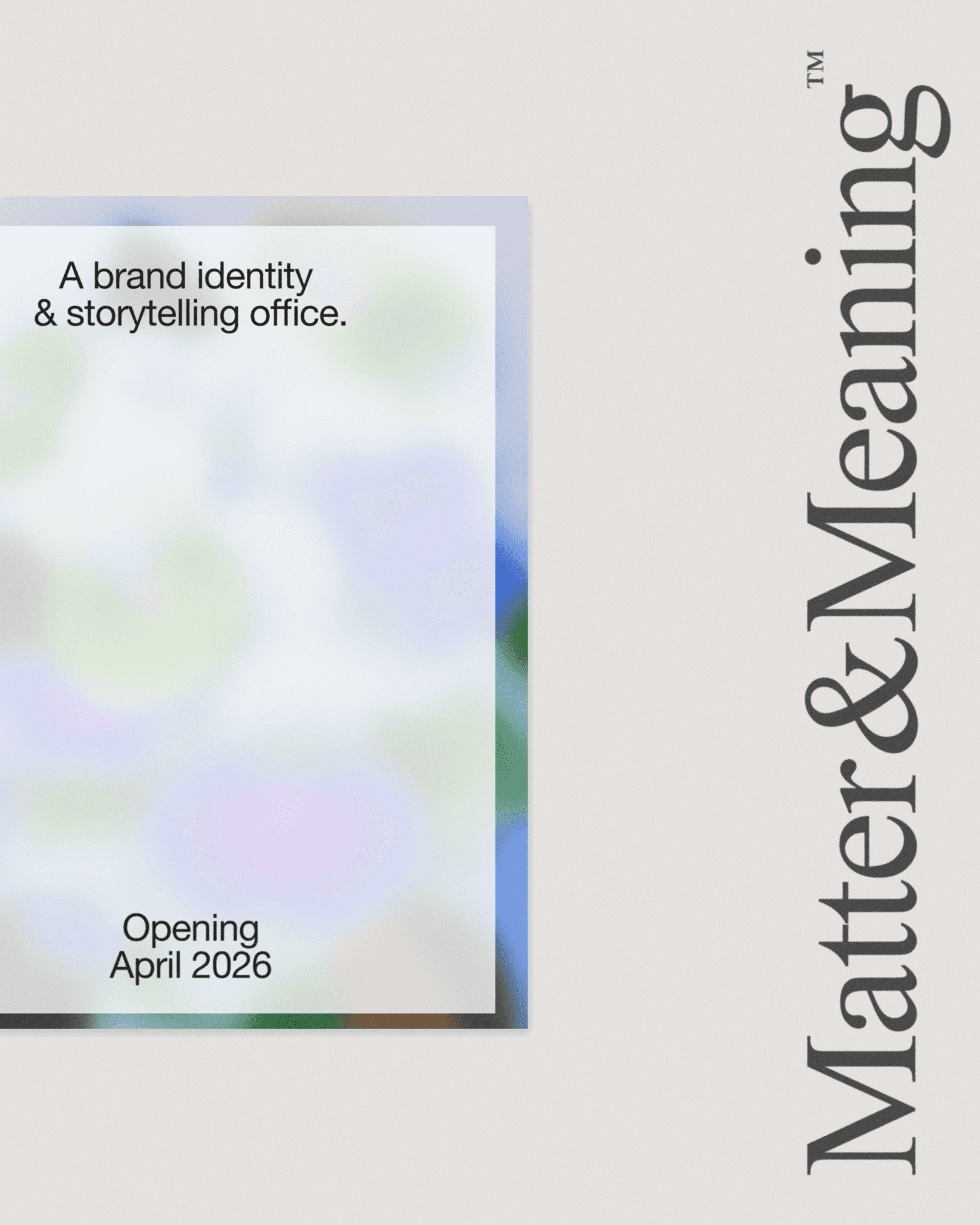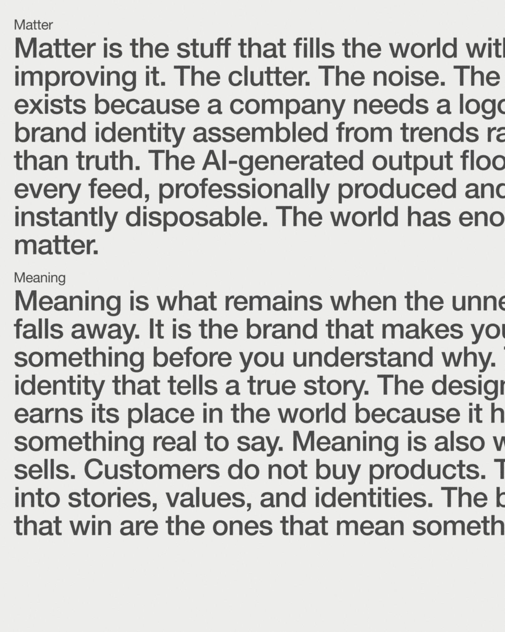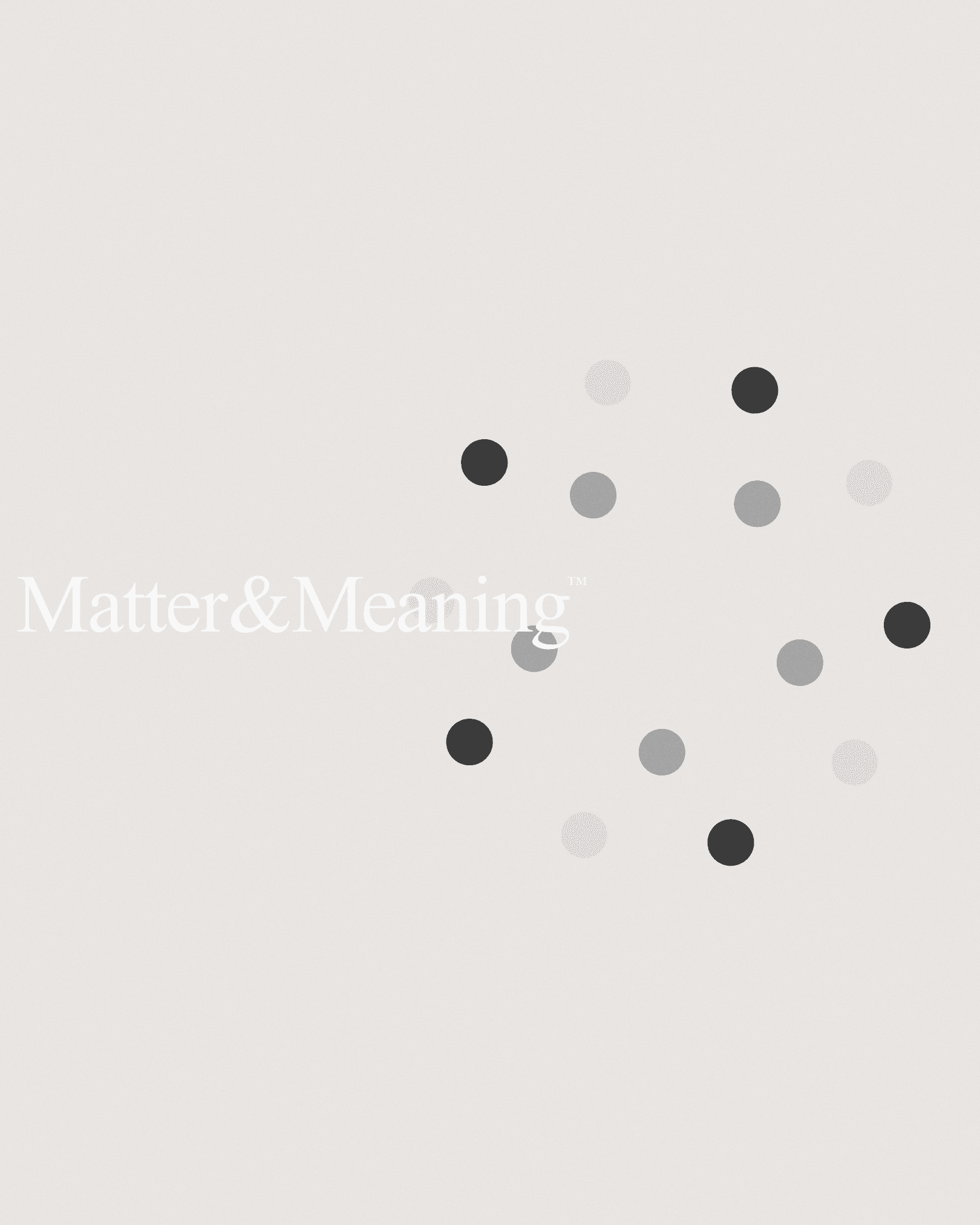 Matter & Meaning is a London-based design office for ambitious brands that refuse to blend in. Brand is not decoration. It is infrastructure. We find the meaning that is already true about what you have built and make it impossible to ignore. Less matter, more meaning.