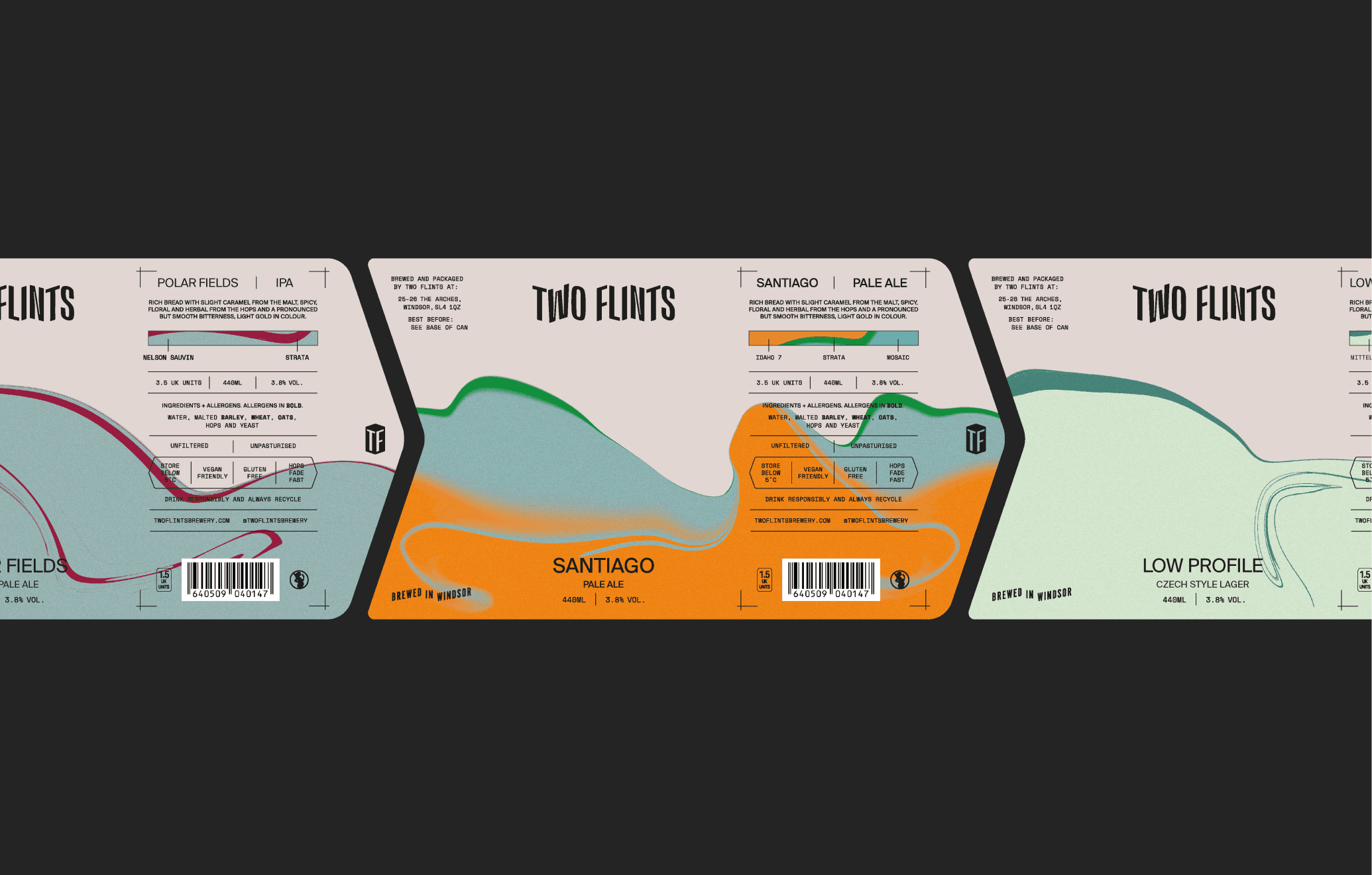 A complete brand system spanning packaging, taproom collateral, merchandise, and digital. The hop matrix gave the brand an engine for infinite variation while the core identity stayed coherent. Every touchpoint, from the pint glass to the can to the t-shirt, reads as unmistakably Two Flints.